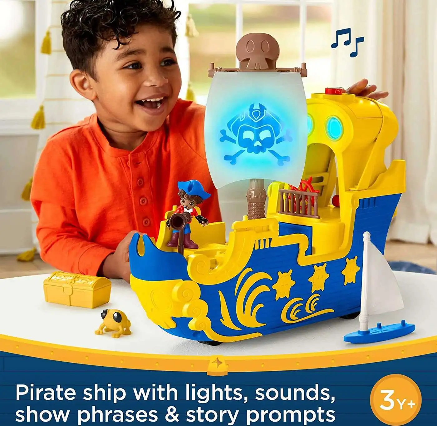 Young Pirate Protectors can bring to life all the exciting high-seas action of Nickelodeons Santiago of the Seas series with this interactive Lights & Sounds El Bravo Pirate Ship playset from Fisher-Price. Kids can spin and press the compass or push the Santiago button to hear familiar character phrases, action sounds and full pirate adventure story prompts to steer their imaginative play, while multi-color lights project on the ships sails. Roll the ship along for cool wave motions as kids set sail on treasure-hunting quests with Santiago and Kiko!