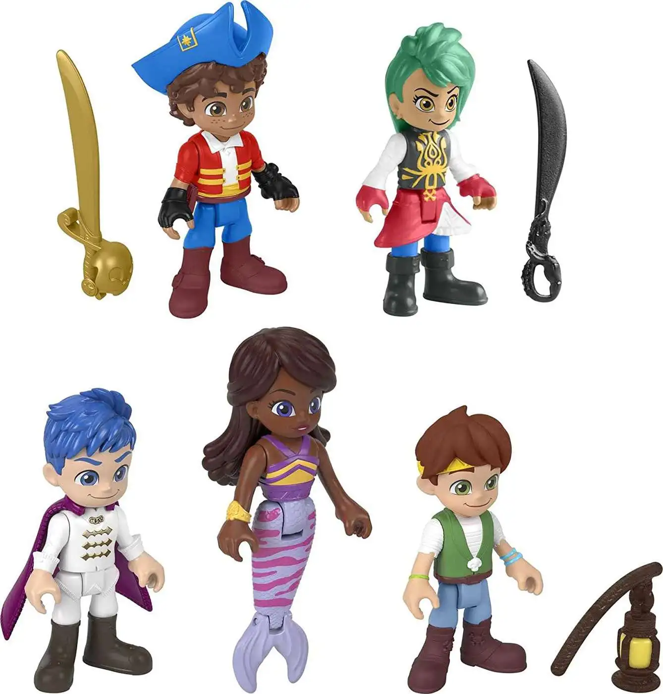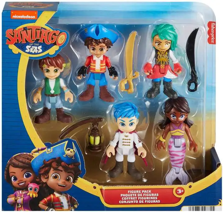 Young fans of the Nickelodeon animated series Santiago of the Seas can set sail for their own action-Packed imaginative adventures with this set of 5 poseable figures from Fisher-Price. This set offers endless imaginary high-seas quests with the Pirate Protectors: Santiago, his cousin Toms, and mermaid friend Lorelai, plus mischievous pirates Enrique Real de Palacios the Third and Bonnie Bones. Santiago and Bonnie Bones figures come with sword play pieces and Toms with his handy lantern for added pretend play.