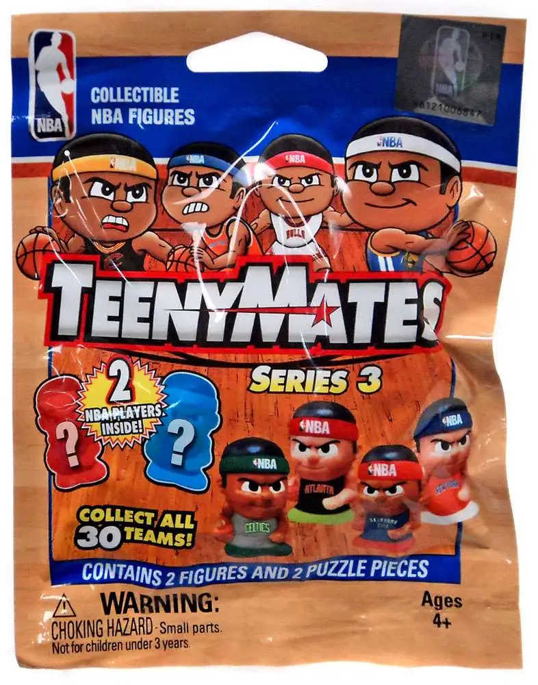Party Animal NBA TeenyMates Series 3 features all 30 NBA teams plus 4 rare, hard to find figures. Completed double-sided puzzle features a mini poster on one side and a basketball court on the other. Inside each blind pack find 2 random 1-inch NBA TeenyMate figures plus 2 double sided puzzle pieces and a collector’s checklist.