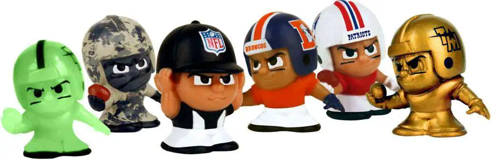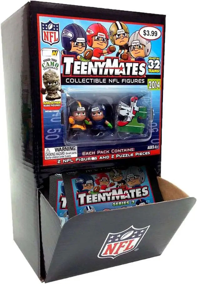 Series 3 NFL TeenyMates are the ultimate 1″ mini-collectible figures! Each TeenyMates 4-Piece Set blind pack comes with 2 random NFL figures and 2 random double-sided puzzle pieces. TeenyMates are available now in this attractive gravity feed display box which hold 32 packs. Collect all 32 NFL players, plus 6 rare figures: A Throwback Broncos Figure (1/256packs), a Throwback Patriots Figure (1/128packs), a Metallic Gold player (1/512packs), a Camouflage figure (1/37packs), a Glow-in-the-Dark player (1/64packs), and a Ref (1/171packs)! PLUS, collect all 35 puzzle pieces and build a BRAND NEW double-sided puzzle featuring a football field playset and collector mini-poster!