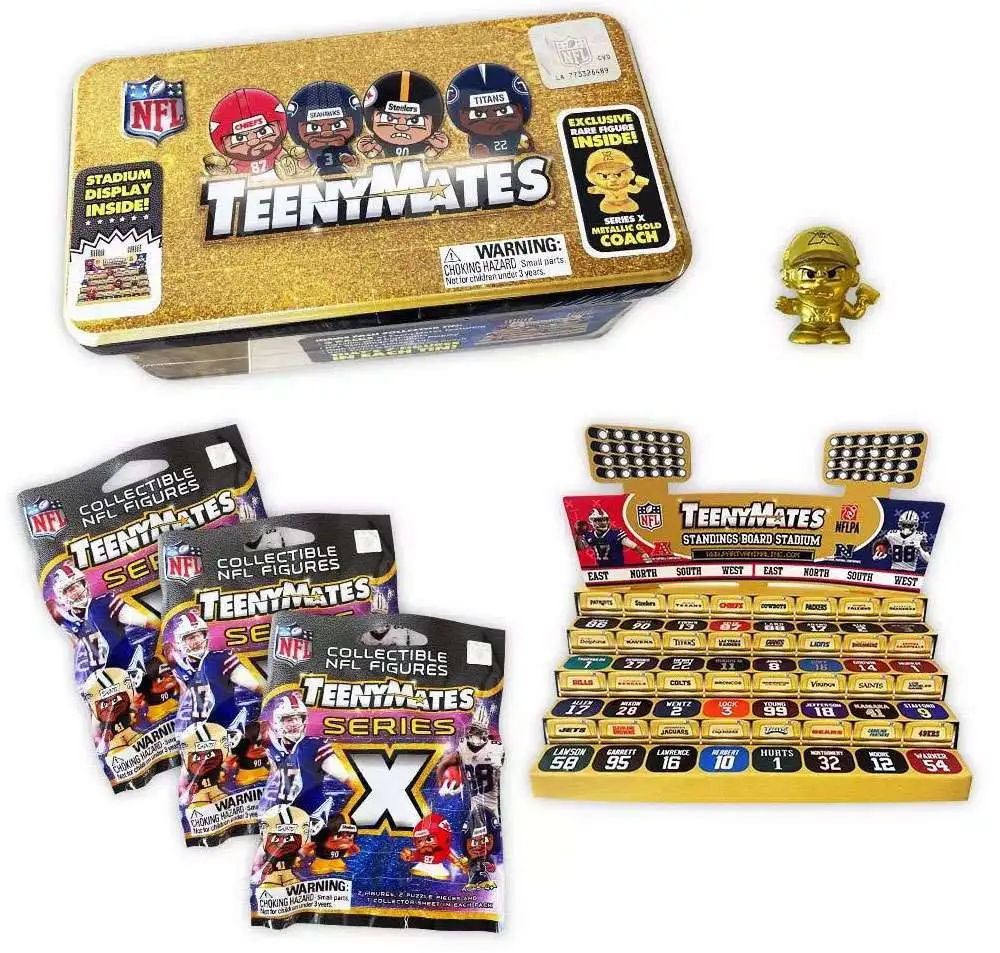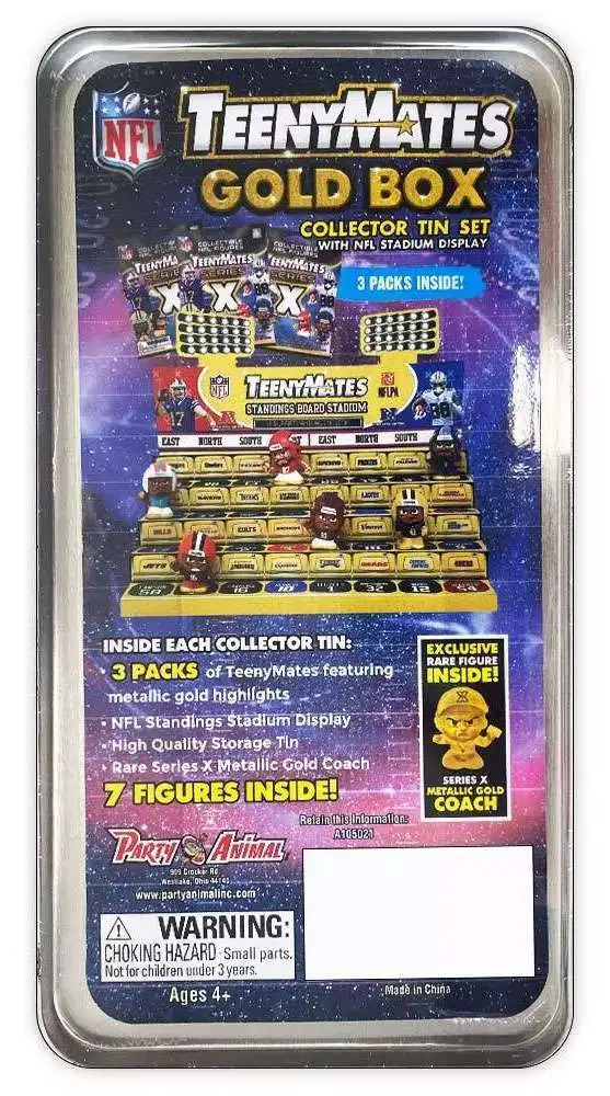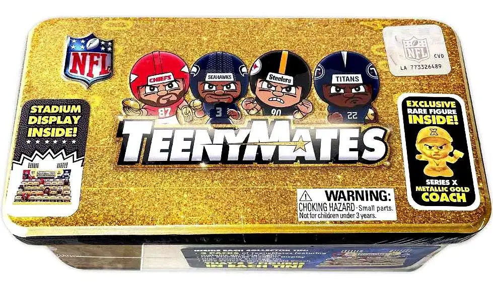 All the action in the palm of your hand! Now you can own all of your favorite NFL superstars with the Teenymates Gold Box Collector Tin Set! Each tin contains 3 packs of TeenyMates featuring metallic gold highlights, NFL Standings Stadium display, high quality storage tin, rare series X metallic gold coach and 7 figures!