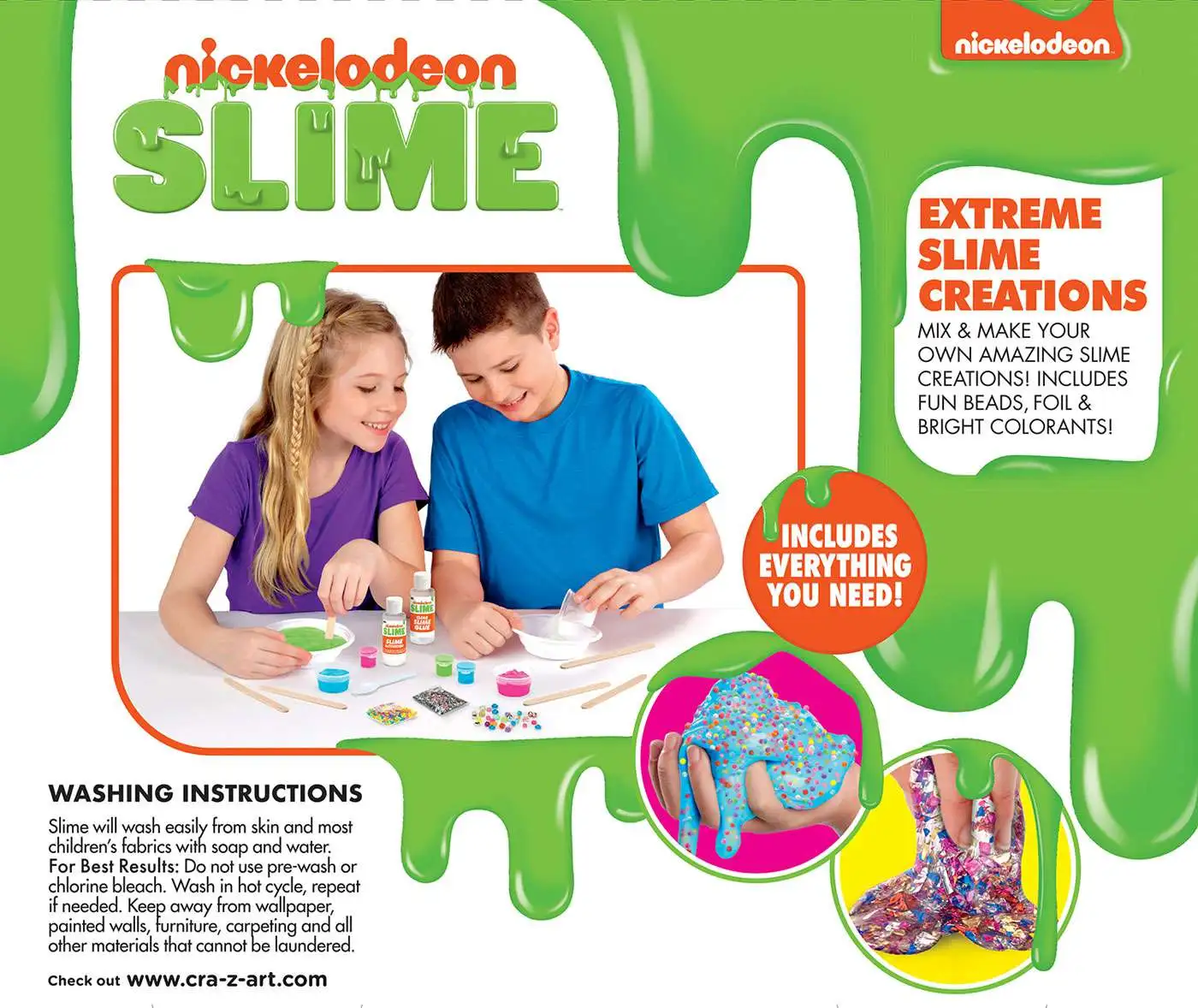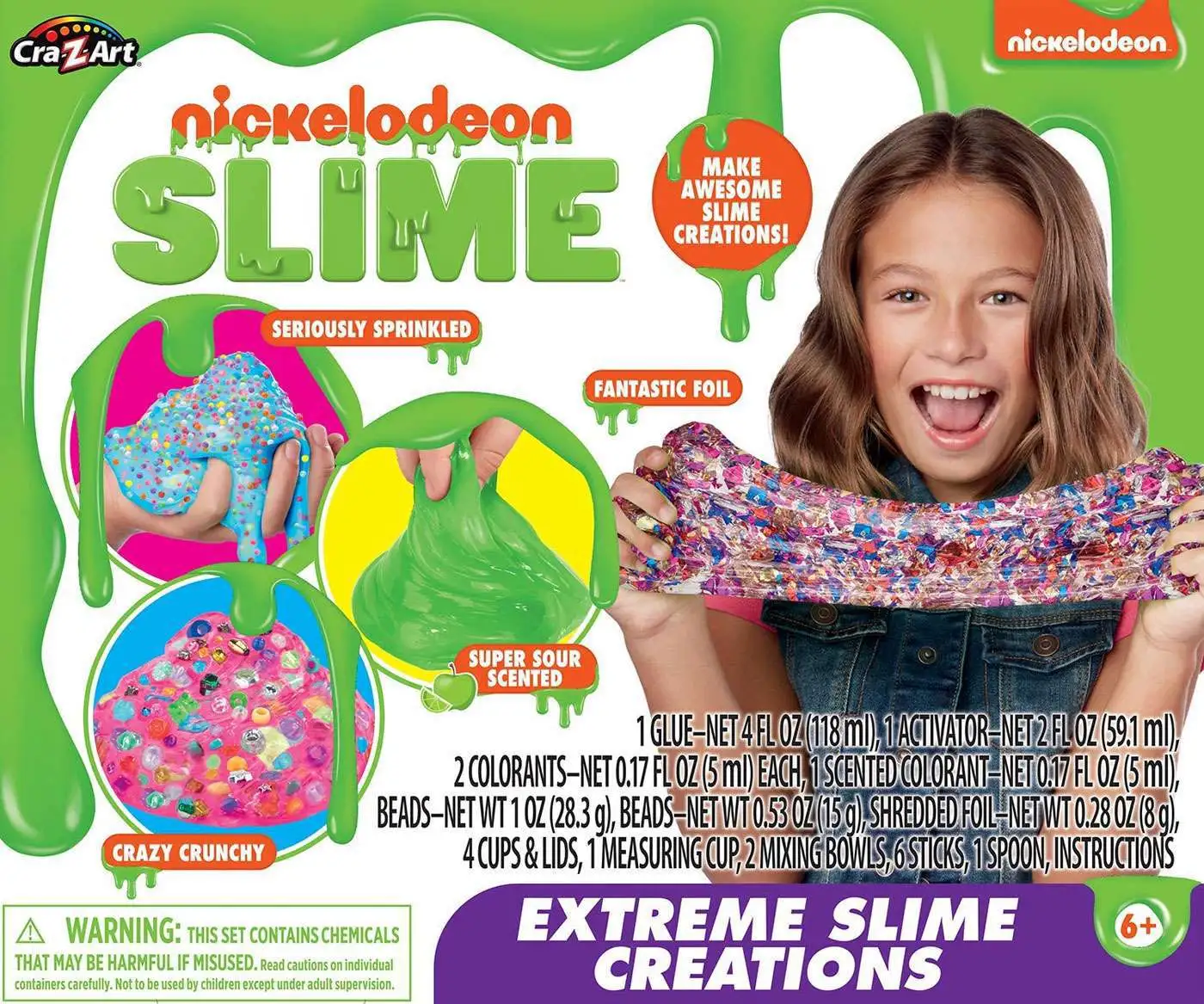 NICKELODEON OVER THE TOP SLIME by Cra-Z-Art! Create unique and one of a kind slime with the Extreme Slime Creation kit by Cra-z-art! Combine sparkles, unique foils and, sour scents to make awesome creations! Comes with everything needed to get started! With hours of fun this is one kit you will want! Great for ages 6+