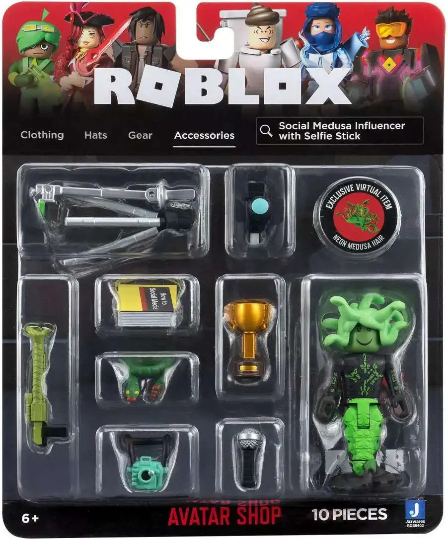 Her presence on social media is setting the world on fire! On second thought, shes just turning it to stone. The Social Medusa Influencer with Selfie Stick set comes with an action figure and multiple accessories inspired by some of the most popular items in the Roblox Avatar Shop. Mix-and-match each item to create your own unique character!