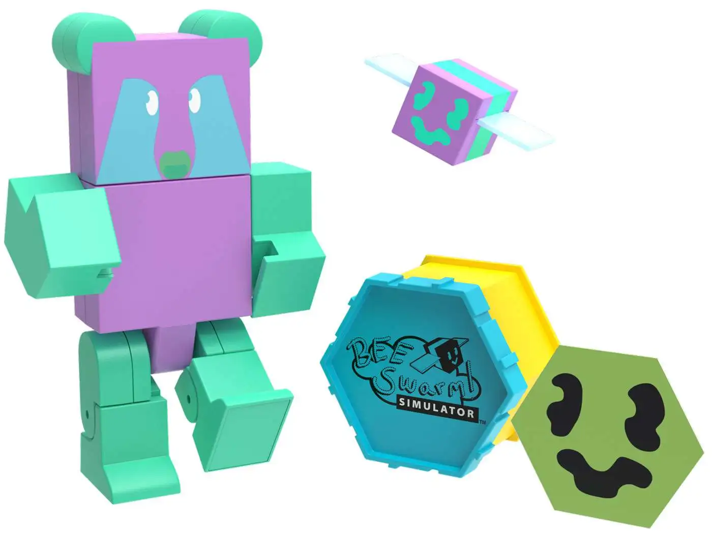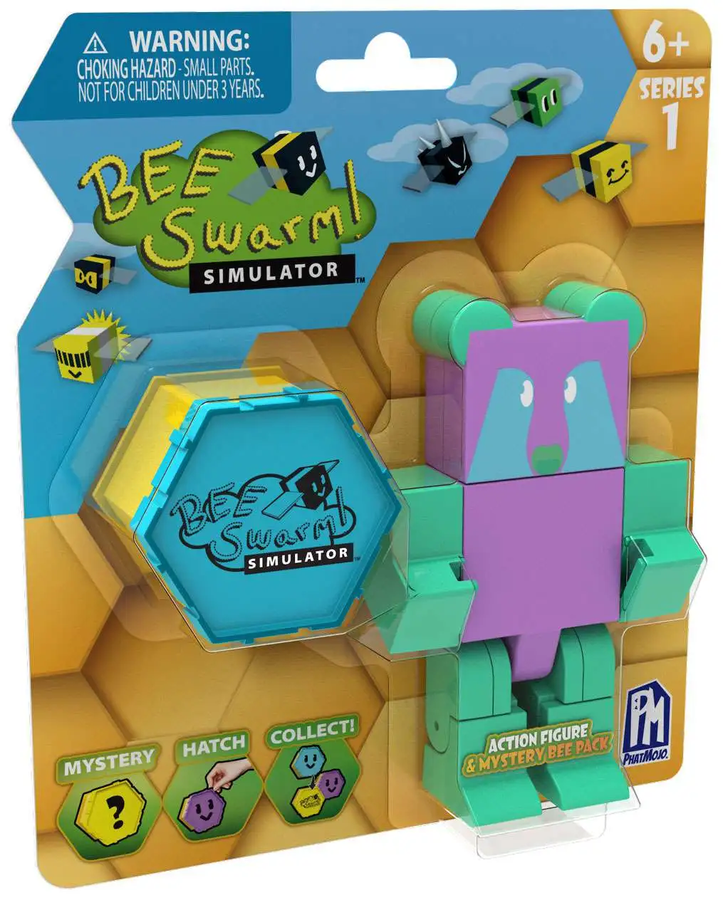Introducing the Bee Swarm Simulator Gummy Bear Action Figure Pack, with Mystery Bee! This pack features an articulated 5 Gummy Bear figure, 1 Mystery Bee, sticker, and honeycomb compartment case. Collect Series 1, Bear Action Figures today!