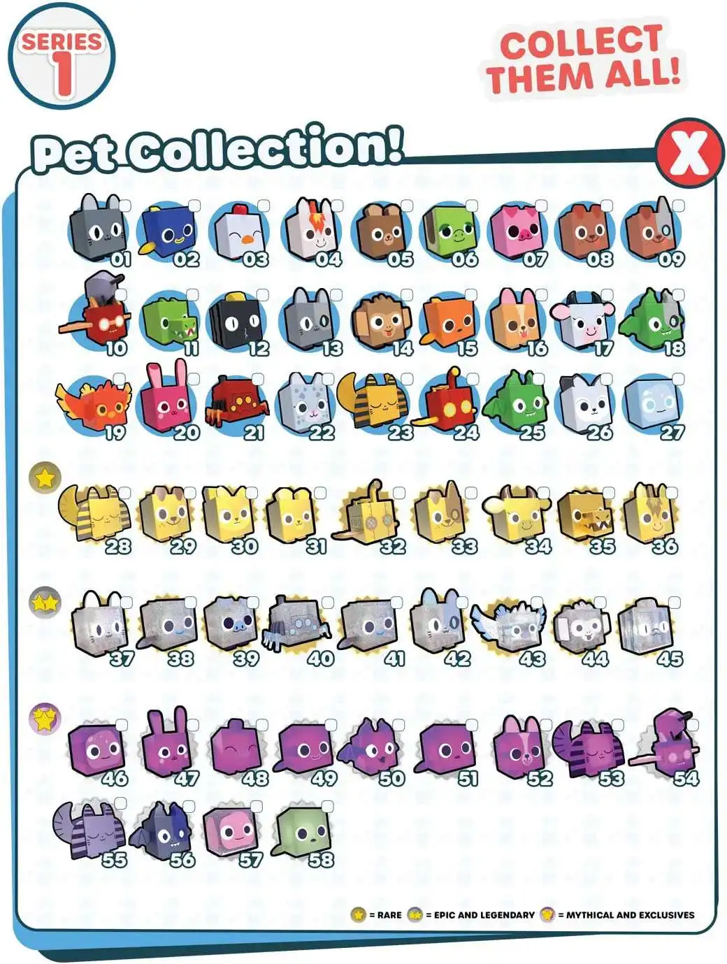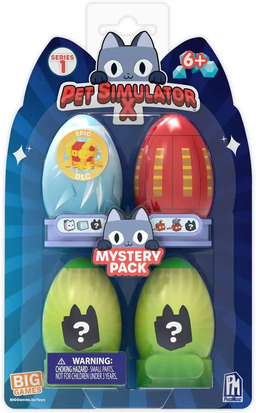 Hatch eggs and discover your new pet, with the Mystery Pet 4-Pack from the hit game, Pet Simulator X! Each egg will reveal 1 of 48, Series 1 pets! All packs include a valuable DLC code! Build your pet collection today. You never know when youll find a rare Rainbow, Golden, or Dark Matter pet!