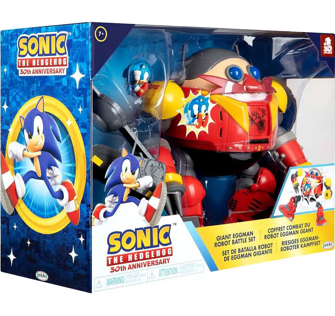 The Giant Eggman Robot Battle Set is sure to be a hit with kids and Sonic fans! You can recreate the action from the games with this extraordinarily detailed battle set and its playable features. Including a Spin Attack Sonic figure and catapult, where you can drop Sonic in and launch him at the Giant Eggman Robot. The Giant Eggman Robot features a rotating damage progression chest plate, a jetpack with sliding booster flames, launchable hand missiles and articulated limbs. Build your Giant Eggman Robot Battle Set into a Sonic world by adding more Sonic friends, playsets and accessories (each sold separately).